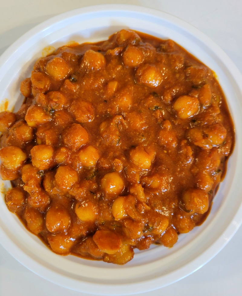 Chickpeas slowly simmered in a fragrant tomato-based sauce made with Grand-maman Rehana’s homemade spice blend. A mild, non-spicy and comforting vegan dish inspired by traditional homestyle Indian cooking. Vegan, nut free, Gluten-free