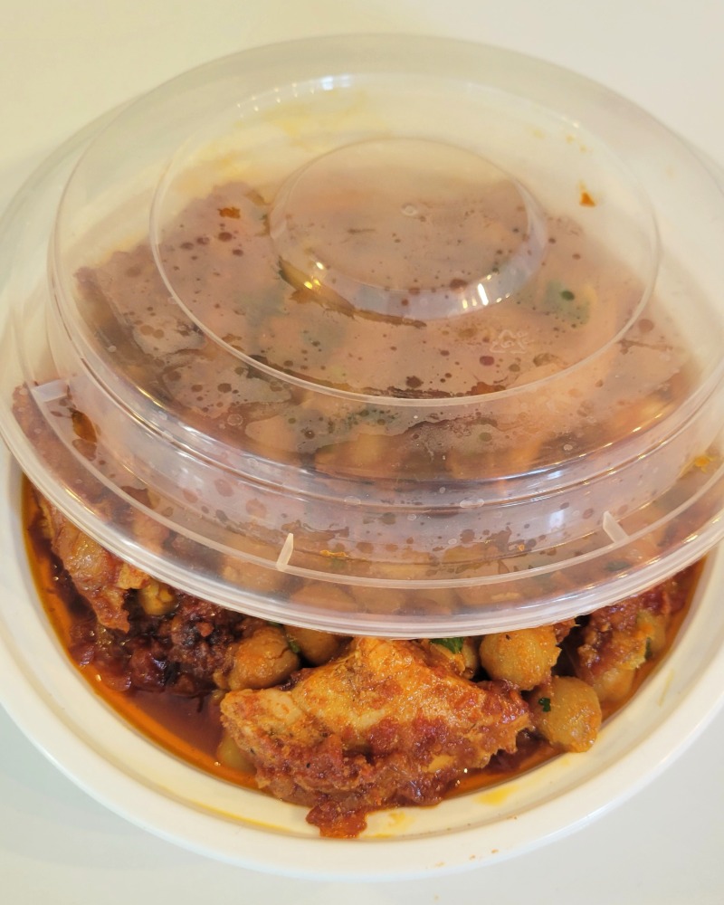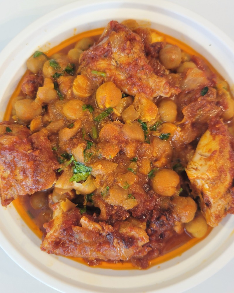 Chickpeas and tender chicken gently simmered in a tomato sauce scented with homemade Indian spices, garlic and ginger. A mild, comforting dish, not spicy, true to homemade Indian cooking. Gluten-free.