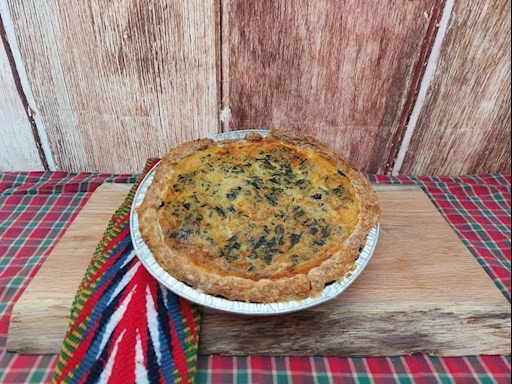 Ingrédients: épinard, oignon doux, oeuf, poudre à pâte, farine, crème 35%, crème sure, poudre d'ail, sel, poivre, fromage cheddar. Croute: farine, shortening végétal, 7up, sel, oeuf.