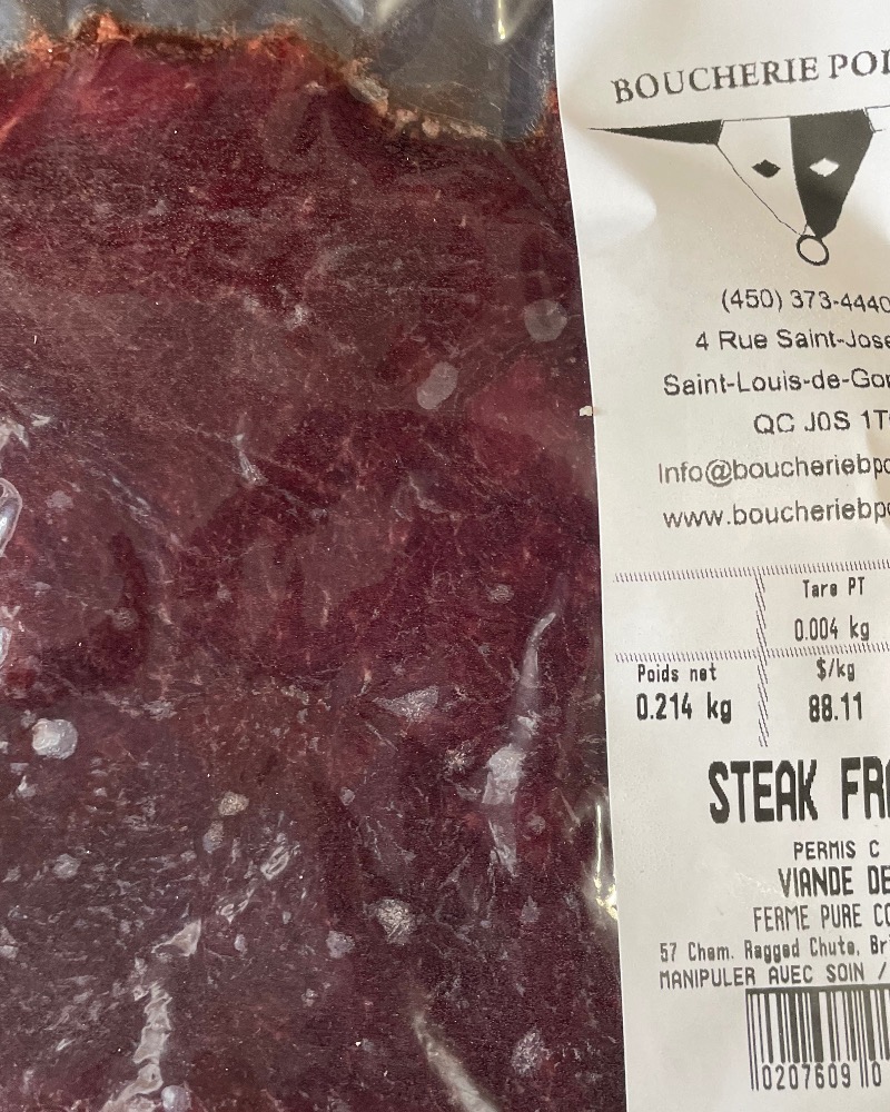 French Steak – Lean & Tender: 2 steaks per package Our French steak is a very lean cut, naturally tender thanks to careful mechanical tenderizing. This process allows for a steak that cooks beautifully while remaining soft and enjoyable. With its clean flavor and delicate texture, French steak can be cooked up to medium without losing tenderness. For best results, cook it hot and fast: preheat your pan or grill well, season simply, sear quickly on each side, and let it rest briefly before serving. An excellent everyday steak — simple, satisfying, and easy to cook.