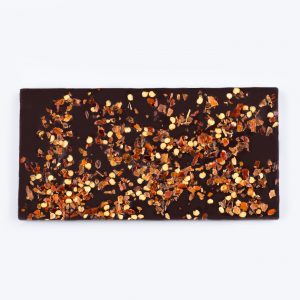 Dark chocolate 70% garnished with espelette pepper, dried tomates and sea salt