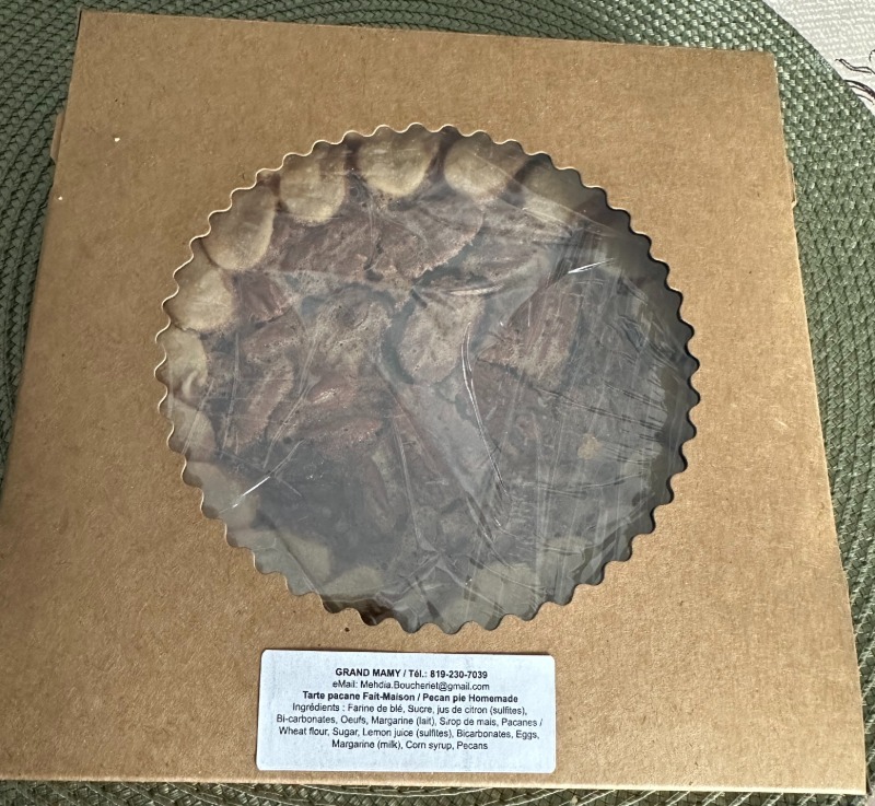 Homemade Pecan Pie – Grand-Mamy’s Traditional Recipe Enjoy a homemade pecan pie crafted with love and passion, following Grand-Mamy’s cherished local recipe. The rich filling made with corn syrup and crunchy pecans sits on a tender, hand-prepared crust, offering a comforting dessert full of warmth and flavour. Perfect as a snack or to share with loved ones. Stays wonderfully crisp for up to 1 week in the refrigerator or 3 months in the freezer. Ingredients: Wheat flour, sugar, lemon juice (sulphites), bicarbonates, eggs, margarine (milk), corn syrup, pecans