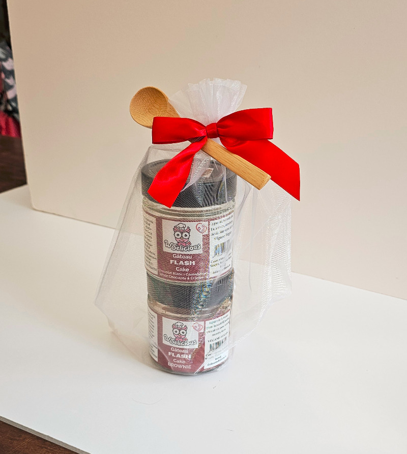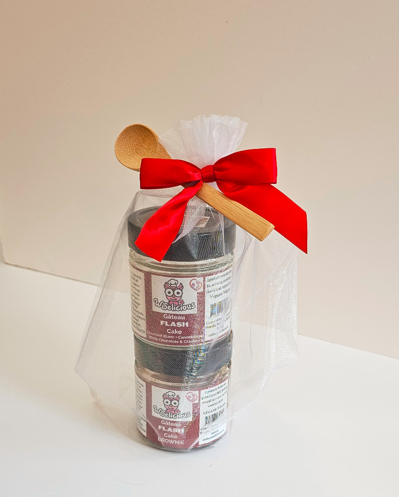 2 Superbes Gâteaux FLASH saveur BROWNIE Prêts en 2 minutes! VÉGANE! Dans un joli emballage cadeau avec cuillière de bois et boucle Juste ajouter 1/3 tasse de purée de pommes Mélanger Cuire au four Micro-Onde 2 minutes Déguster avec la belle cuillère de bois! Le tout emballé avec boucle et cuillère de bois en décoration. INGRÉDIENTS Brownies: Farine sans gluten (non certifié), lentilles, ppites de chocolat noir, cacao, sucre de canne, épices