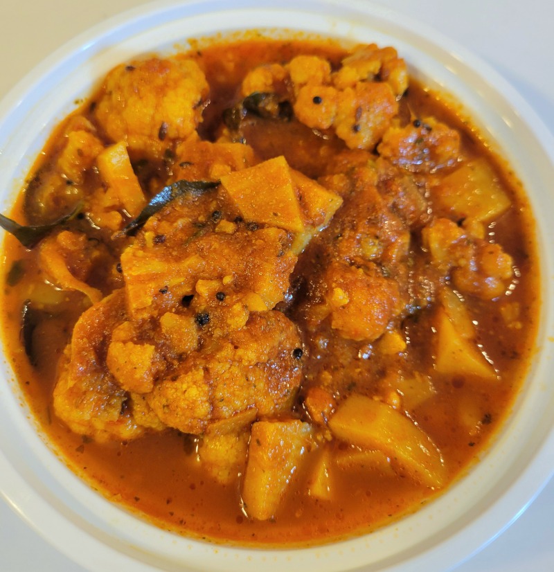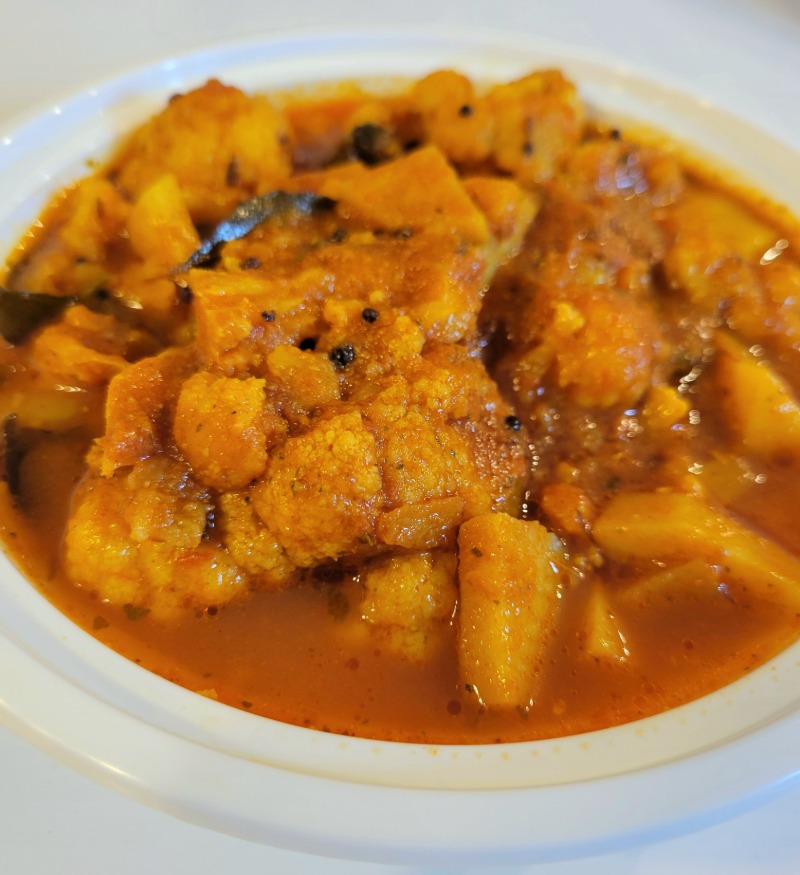 Des morceaux de pommes de terre et de chou-fleur mijotés doucement avec nos épices maison de Grand-maman Rehana. Un cari végétalien parfumé, simple et réconfortant, non piquant, inspiré de la cuisine indienne maison. Vegan et sans gluten