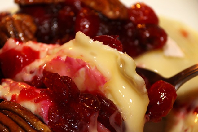 Ingrédients: fromage brie, canneberges, oignons, sucre, sirop d'érable, vin rouge, feuilles de laurier, carvi, sel et poivre