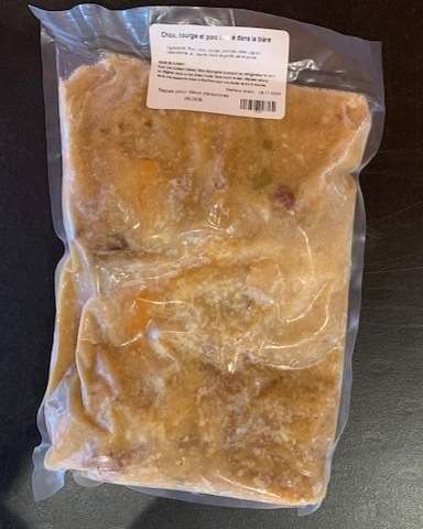 Repas pour 2 personnes Ingrédients: porc, chou, pommes, céleri, oignon, bière blonde, ail, beurre, clous de girofle, sel et poivre