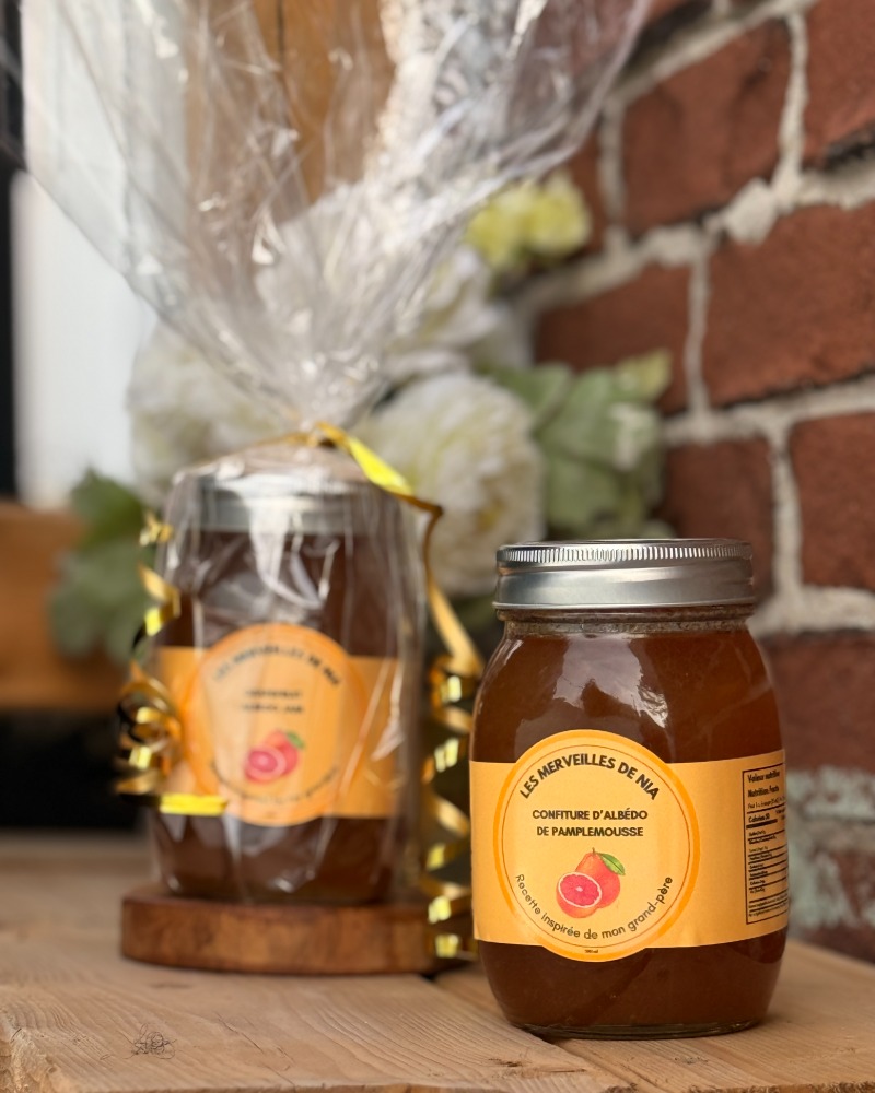 Confiture de pamplemousse unique mettant en valeur l’albédo du pamplemousse, la partie blanche du fruit. Elle offre une saveur délicate, douce et raffinée, sans aucune amertume, inspirée d’une recette familiale.