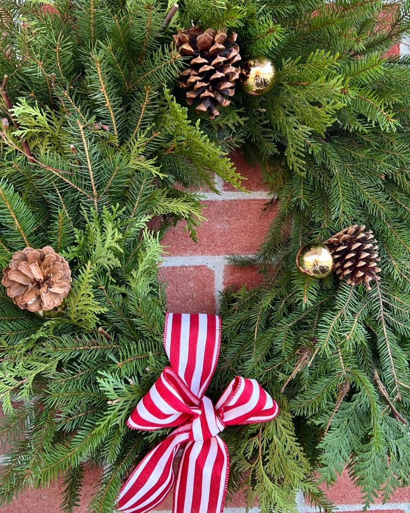 Magnifique couronne de sapinage naturel, confectionnée à la main avec une inspiration festive. Le ruban rouge et les boules de noël sont parfait pour illuminer cette couronne! Parfaite pour décorer votre porte d’entrée, elle apporte une touche naturelle, élégante et chaleureuse à votre maison. Grâce à la fraîcheur hivernale, votre couronne se conservera tout l’hiver. Montée sur un anneau de métal de 24 pouces.