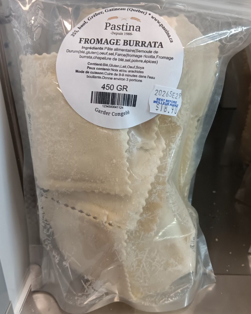 Megadolion à la burrata Un format généreux et gourmand! Notre megadolion est farci d’une burrata crémeuse et délicate, enveloppée dans notre pâte fraîche maison. Un plat riche et raffiné, parfait pour les amateurs de fromage. Format de 450 g, idéal pour environ 3 portions. Comme nous utilisons des ingrédients naturels, la couleur de la pâte peut varier d’un lot à l’autre.