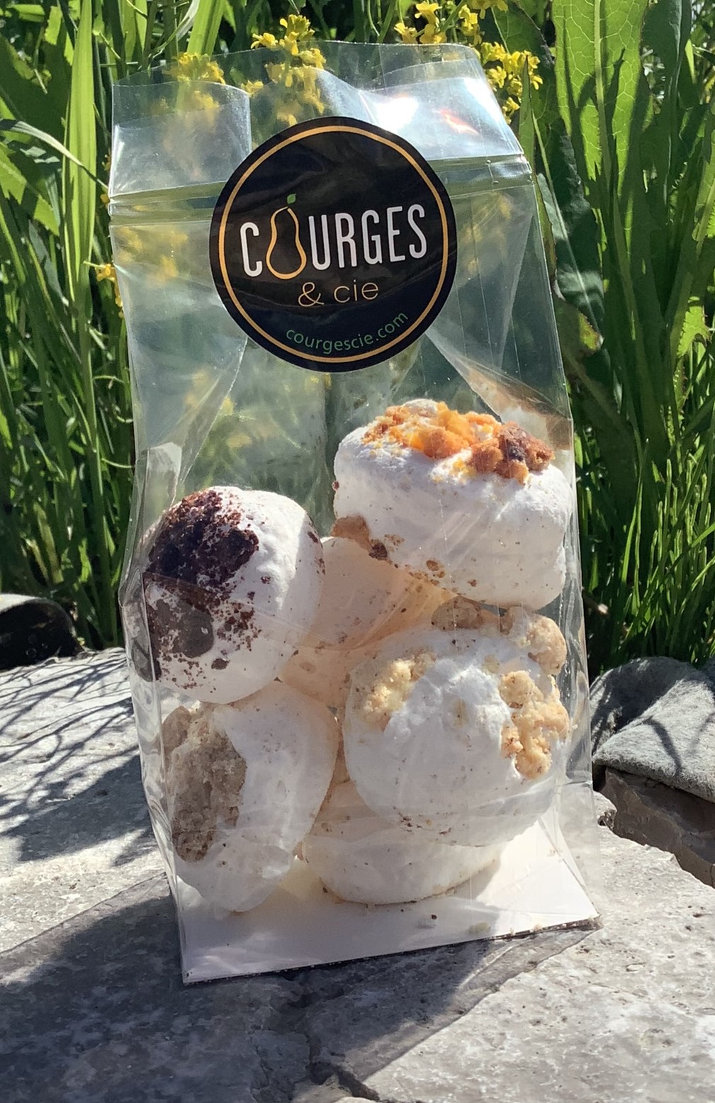 Ingrédients: sucre, blanc d'oeuf, jus de citron, vanille, courge, cacao, lait, fleur de sel, épices de citrouille Grandeur des saces: 7.6cm X 5,1cm X 16,5cm