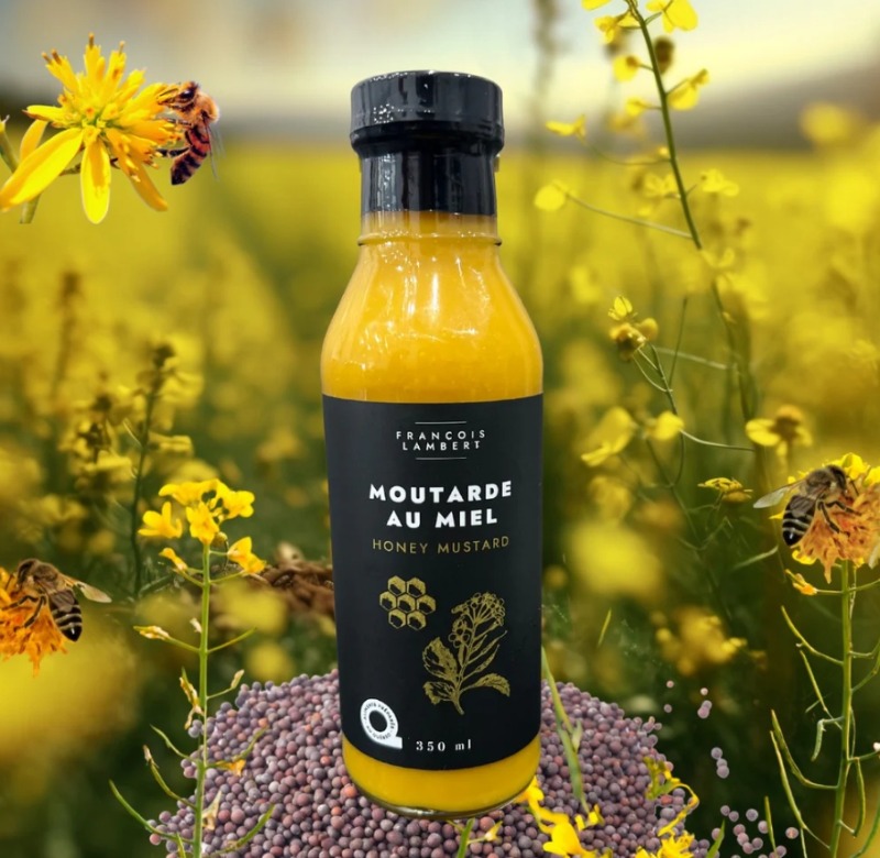 Moutarde jaune (graines de moutarde, vinaigre blanc, eau, sel, curcuma, saveur naturelle, épices), Miel, Vinaigre de cidre.