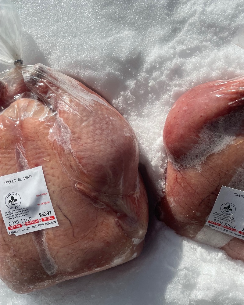 ⚠️ Attention : ce poulet change tout Nos poulets sont élevés à la ferme et nourris avec des grains biologiques. Une fois que vous y aurez goûté, il sera difficile de retourner au poulet commercial sans saveur. Chaque poulet est si immense qu’on peut facilement nourrir un groupe de 6 personnes: savoureux, juteux et rassasiant. Un incontournable pour les amateurs de vraie bonne nourriture.