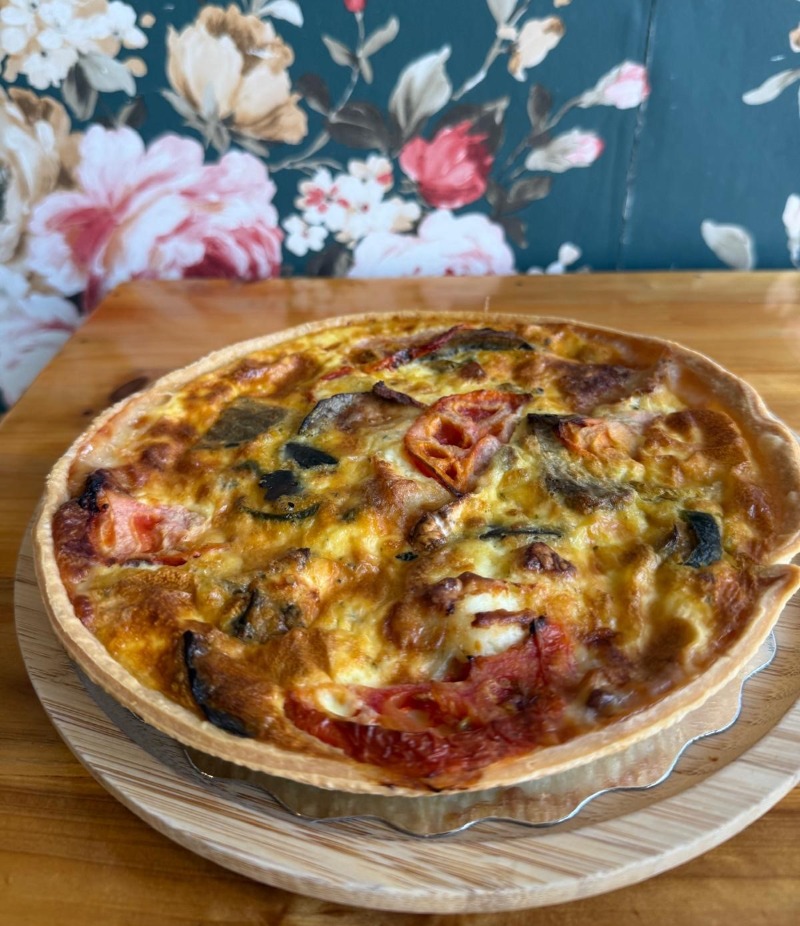 Melanges de legumes (aubergines, poivrons, courgette, tomates,oignons, ail), pesto, fromage de chevre, oeufs, creme, lait, sel, poivre, pâte feuilleté