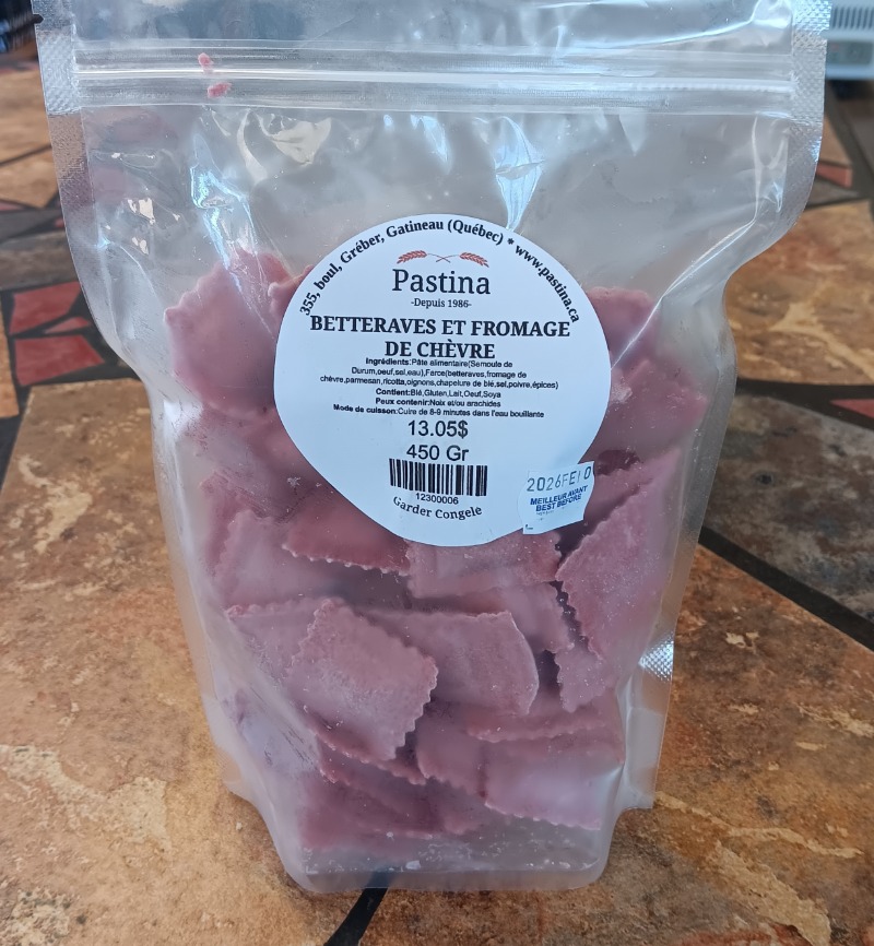 CongeléUn mélange raffiné de betteraves fraîches et de fromage de chèvre crémeux, enveloppé dans notre pâte maison. Ces raviolis colorés offrent un goût à la fois doux, terreux et légèrement acidulé, parfait pour un repas original. Format de 450 g, idéal pour environ 3 portions. Comme nous travaillons avec des ingrédients naturels, la couleur de la pâte peut varier d’un lot à l’autre.