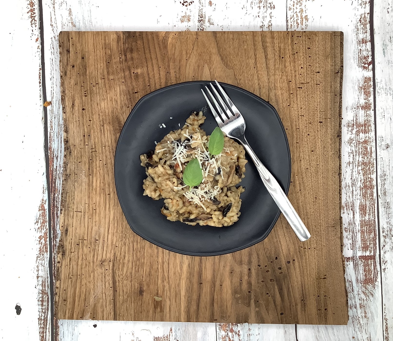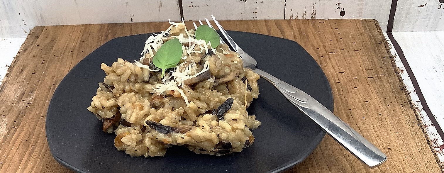 Pour deux personnes Ingrédients: riz arborio, asperges, champignons, bouillon de légumes, oignons, vin blanc, beurre, tomates confits, parmesan râpé