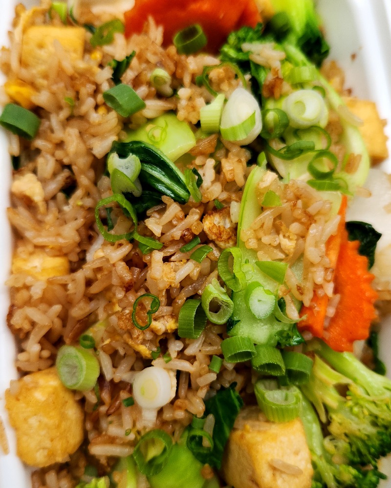 Ingrédients: Riz au Jasmin, Tofu, Oeuf, mélange de légumes, sauce soja, sauce d'huitre, sel, poivre, oignon vert.