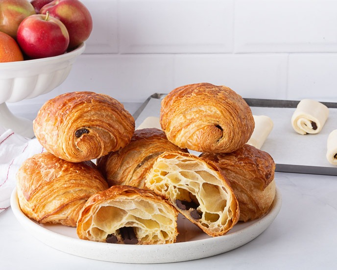 Sac de viennoiseries pur beurre variés. Contient 3 croissants et 3 chocolatines. Vous tomberez en amour avec le croustillant et le riche goût de nos viennoiseries artisanales.