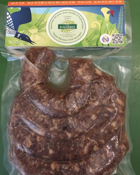 Porc du Québec, sirop d’érable, vinaigre balsamique, thym, persil, ail, sel, jus de citron. Paquet de 4 saucisses.