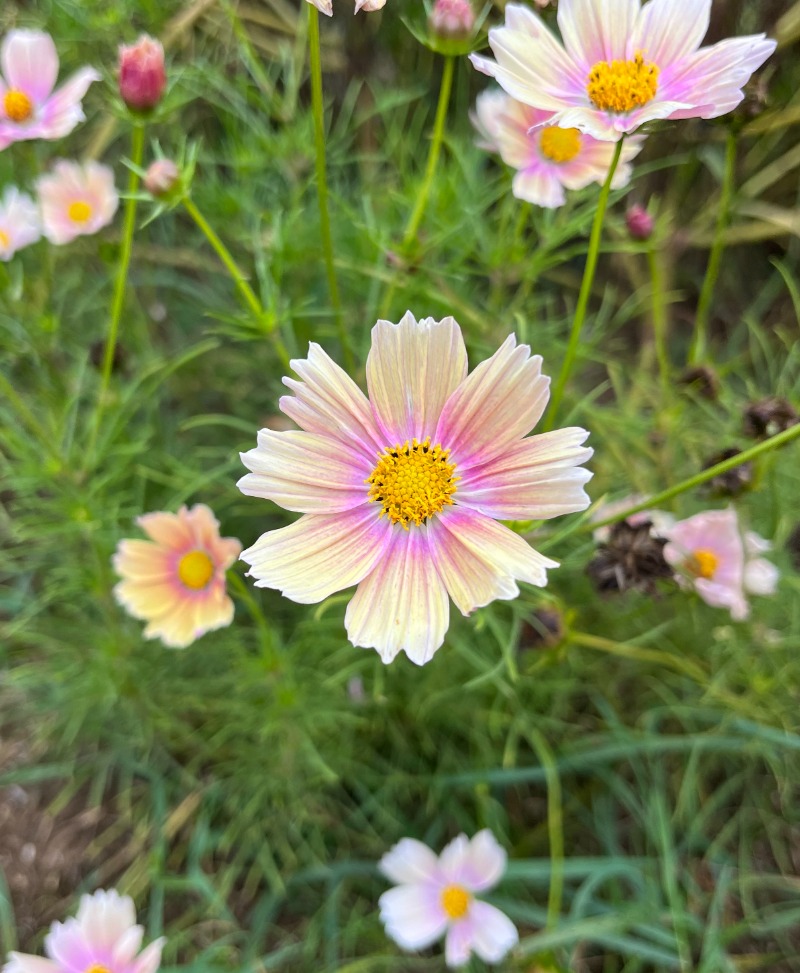 Ce cosmos offre des fleurs spectaculaires aux nuances d’abricot et de rose pâle avec des cœurs dorés. Cette annuelle gracieuse attire les pollinisateurs et ajoute une touche douce et lumineuse aux massifs. Parfaite pour les bouquets, elle fleurit tout l'été, apportant couleur et charme au jardin.