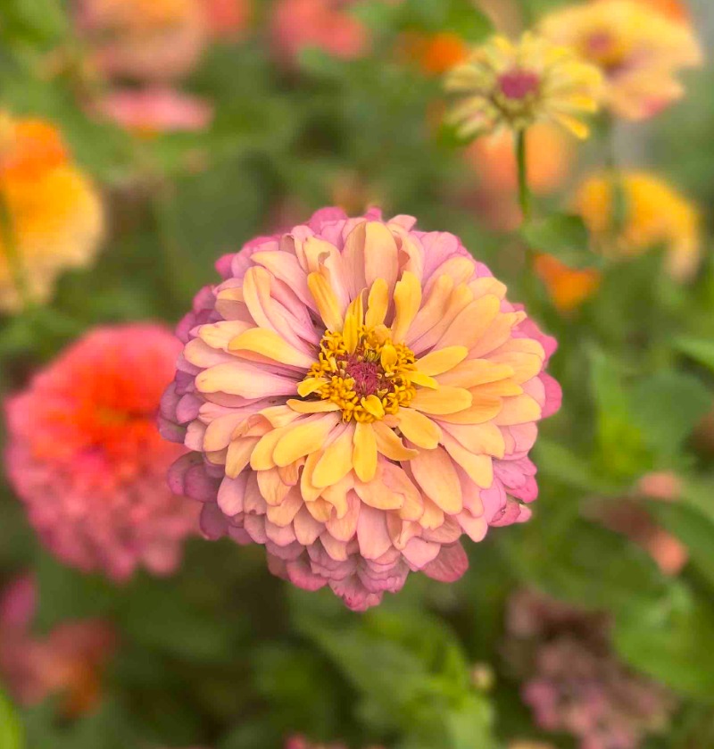 Une annuelle éclatante et florifère qui illumine le jardin avec ses nuances délicatement mêlées. Le Zinnia Aurora produit une profusion de fleurs doubles souvent bicolores ou multicolores — des tons de rose tendre se fondant dans le corail, le doré ou le rouge rosé. Chaque fleur est unique, avec des dégradés riches qui semblent capter la lumière. Ses tiges robustes en font une excellente fleur à couper, idéale pour de magnifiques bouquets tout l’été jusqu’aux gelées. Très appréciée des abeilles et des papillons.