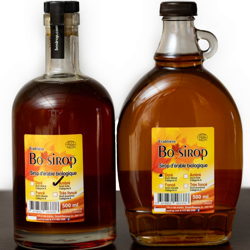 Notre sirop est certifié biologique par le certificateur Écocert Canada. Nous avons la certification pour le sirop vendu en vrac et au détail. Notre sirop est disponible dans les catégories suivantes : Doré (goût délicat), Ambré (goût riche), Foncé (goût robuste). Le sirop destiné à la vente au détail est spécialement sélectionné pour son bon goût parmi notre grande production. Conservation 18 mois.