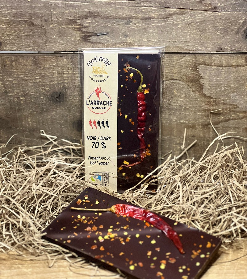 Tablette de chocolat noir 70% garnie de piment arbol 85g