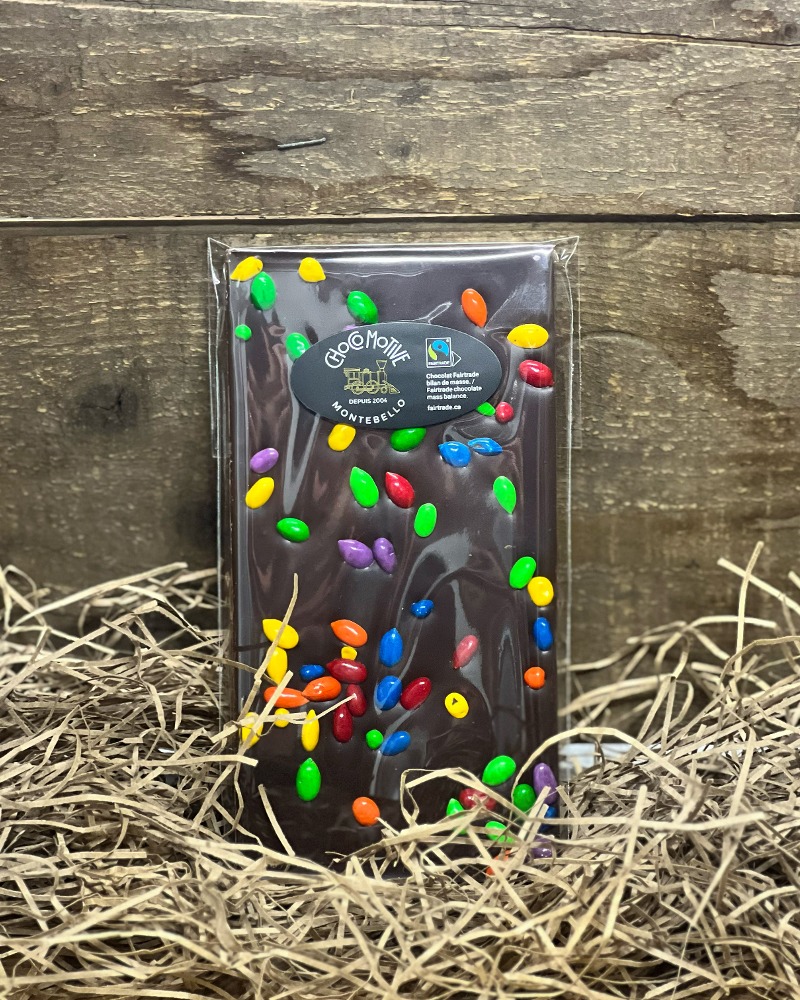 Tablette de chocolat noir 70%, au lait ou blanc garnie de graines de tournesols colorées. 85g