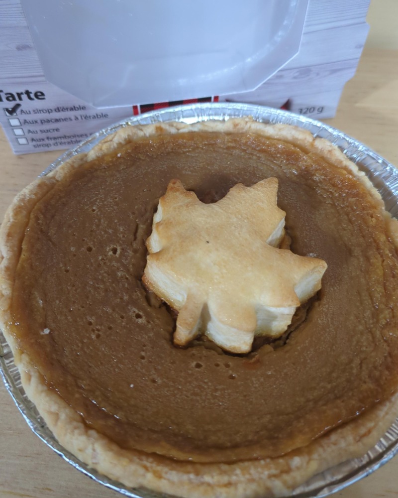 Ingrédients; Lait évaporé, sirop d'érable, œufs, cassonade, farine Pâte à tarte; Farine, graisse végétale, eau gazéifiée, sucre, acide citrique, arôme naturel, citrate de potassium, benzoate de potassium, poudre à pâte, sel